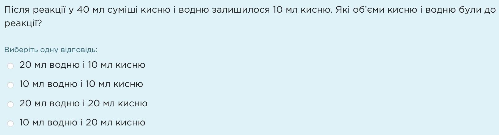Після реакції у 40 мл суміші кисню і водню залишилося 10 мл кисню. Які об’єми кисню і водню були до реакції?