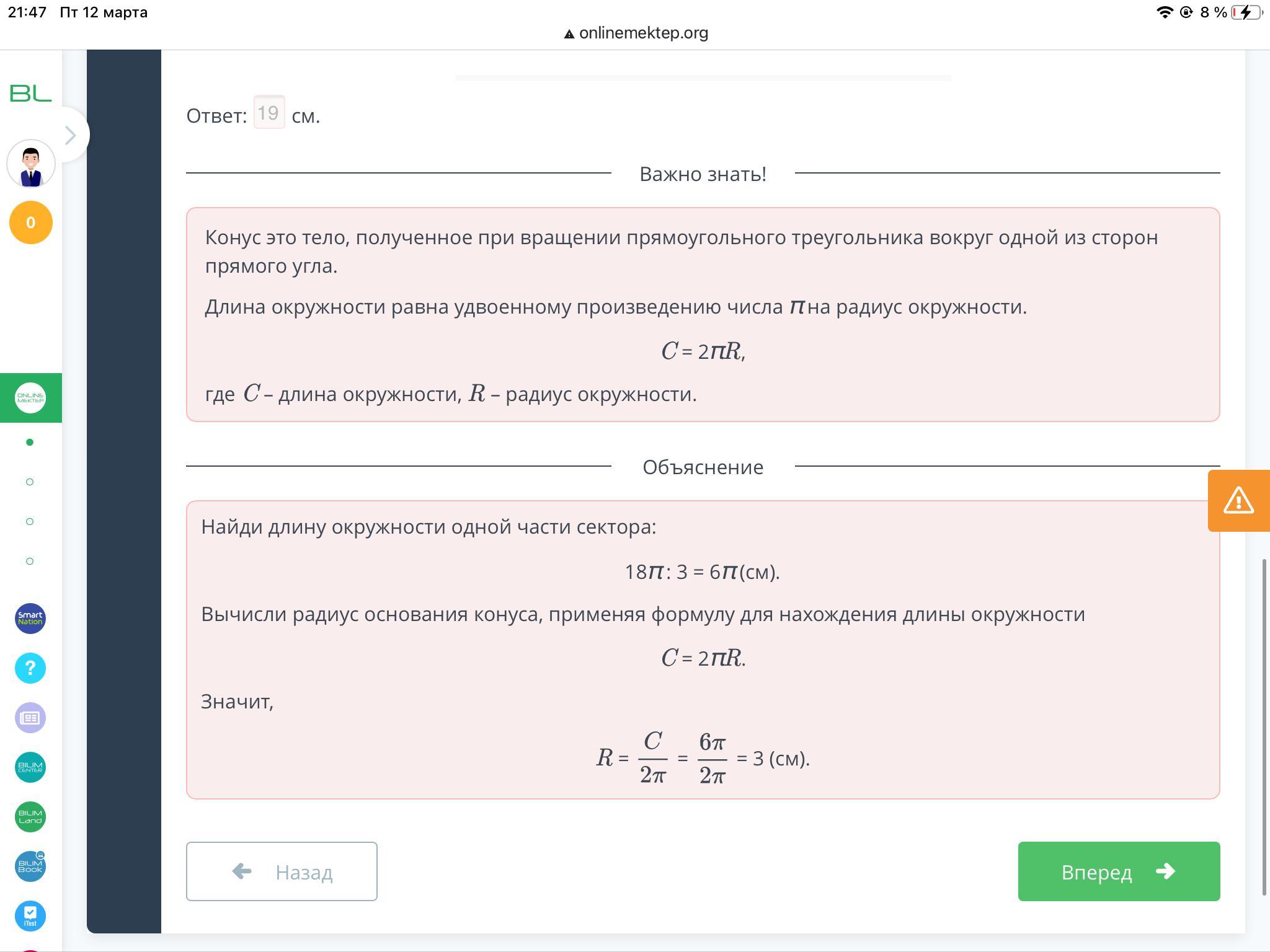 Окружность с длиной 18π см разделен на три равных сектора. Один из секторов свёрнут в конус. Вычисли радиус окружности основания этого конуса.