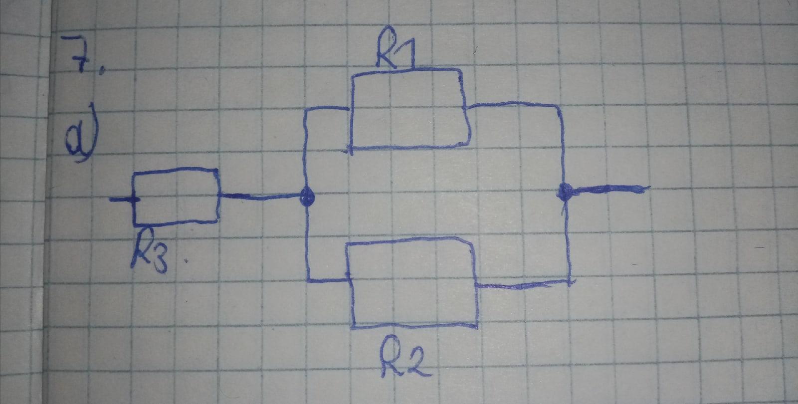 К двум резисторам, соединенным параллельно, подключен последовательно третий резистор сопротивлением R3 =28 Ом . Сопротивление первого резистора R 1 = 12 Ом и второго R 2 = 18 Ом. a) Начертите схему смешанного соединения. (1) b) Определите общее сопротивление. (1) c) Определите силу тока в цепи и силу тока во втором резисторе, если общее напряжение 12 В. (2) d