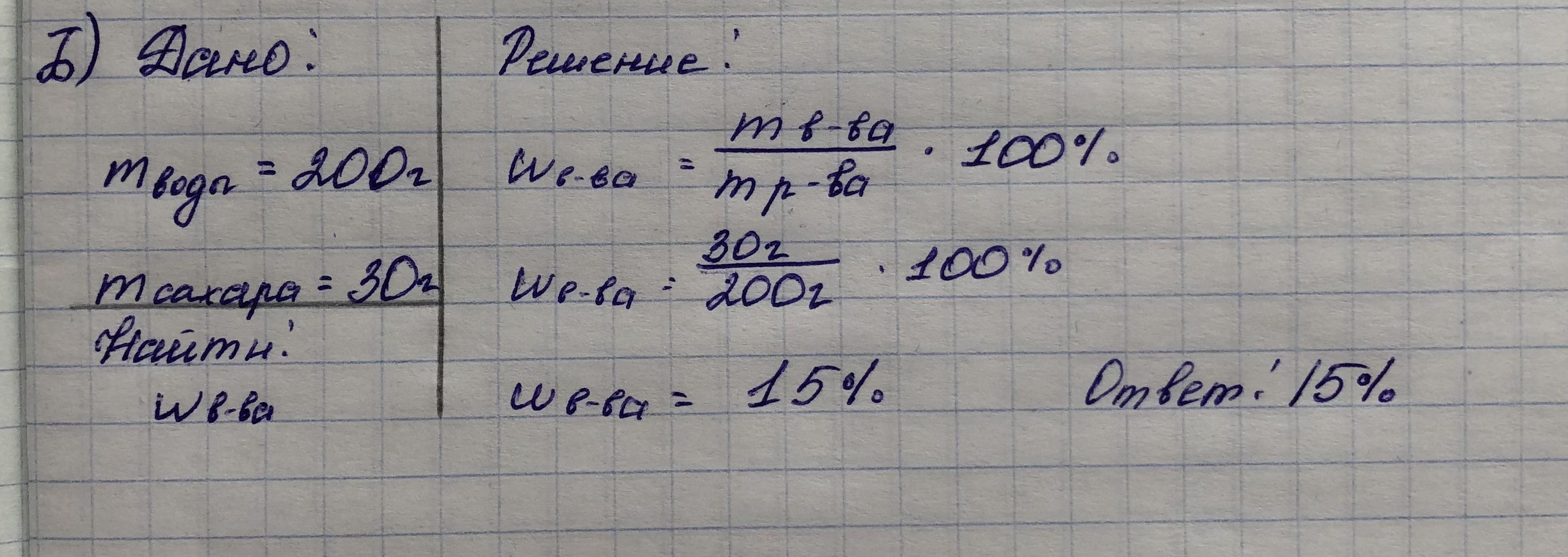 Б) В 200 г воды растворили 30 г сахара. Определите массовую долю полученного