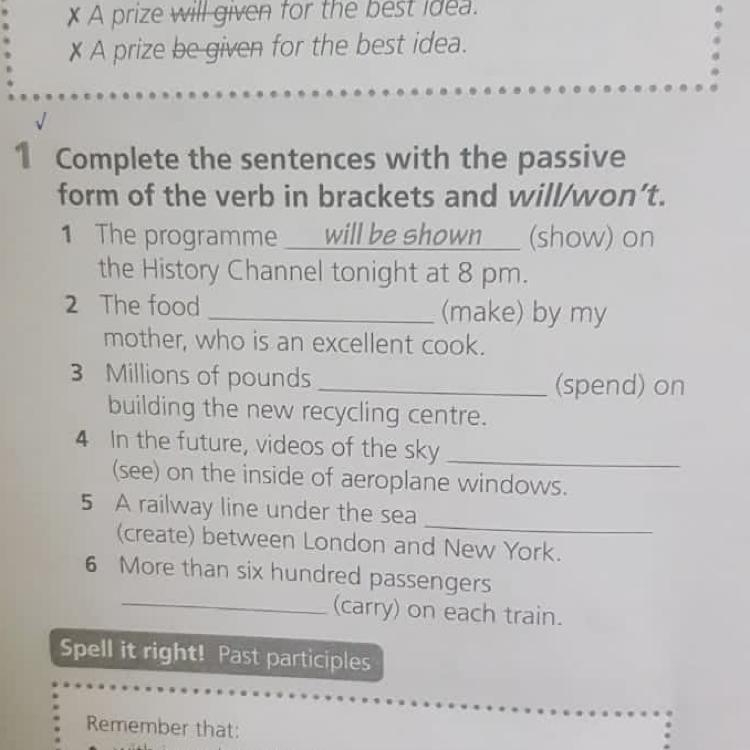 2) will be made 3) will be spent 4) will be seen 5) will be created 6) won't be carried