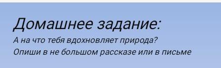 Природа вдохновляет меня в том, что надо, не загрезнять её, ухаживать, ухаживать за цветами, садить новые цветы или деревья.