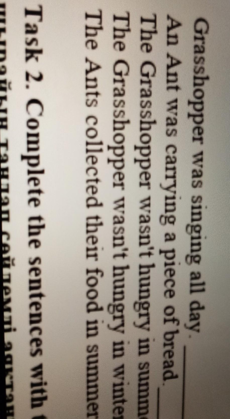 Taskl. Read the text and write True (T) or False (F) next to the sentences. The Ant and the Grasshopper One summer's day a Grasshopper was hopping about in the field, singing and chirping to its heart's content. An Ant passed by, carrying with great effort an ear of com he was taking to his home. «Why not come and have a chat with me,» the Grasshopper said, «instead of fussing all day long?». «I am busy saving up food for the winter,» the Ant said, «and that would be better for you to do the same.» «Why bother about cold?» the Grasshopper answered; «we have got a lot of food at present.» But the Ant went on its supply. When the winter came the Grasshopper got very cold and hungry while it kept watching the ants replete with corn and grain from the stores they had collected and saved in the summer. Then the Grasshopper understood.. Write True (T) or False(F) 1. Grasshopper was singing all day. 2. An Ant was carrying a piece of bread. 3. The Grasshopper wasn't hungry in summer 4. The Grasshopper wasn't hungry in winter 5. The Ants collected their food in summer