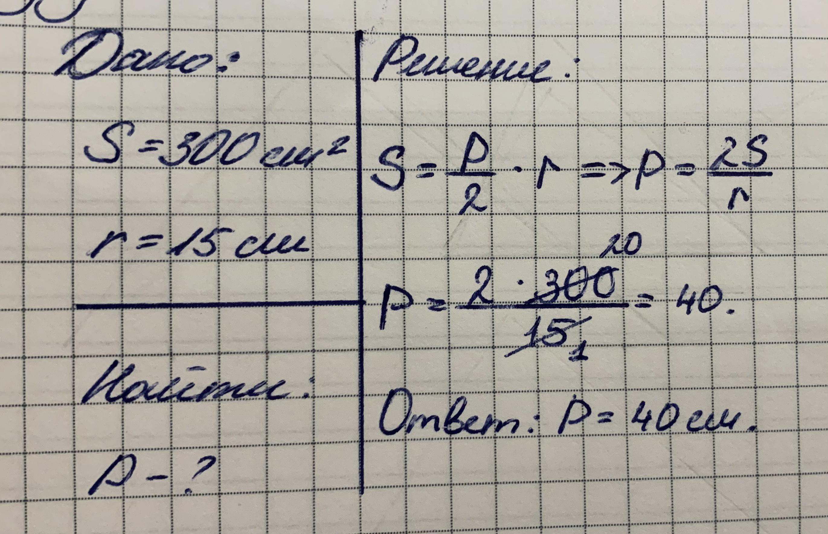 площадь треугольника равна 300 см в квадрате а радиус окружности вписанной 15см найдите периметр треугольникаё