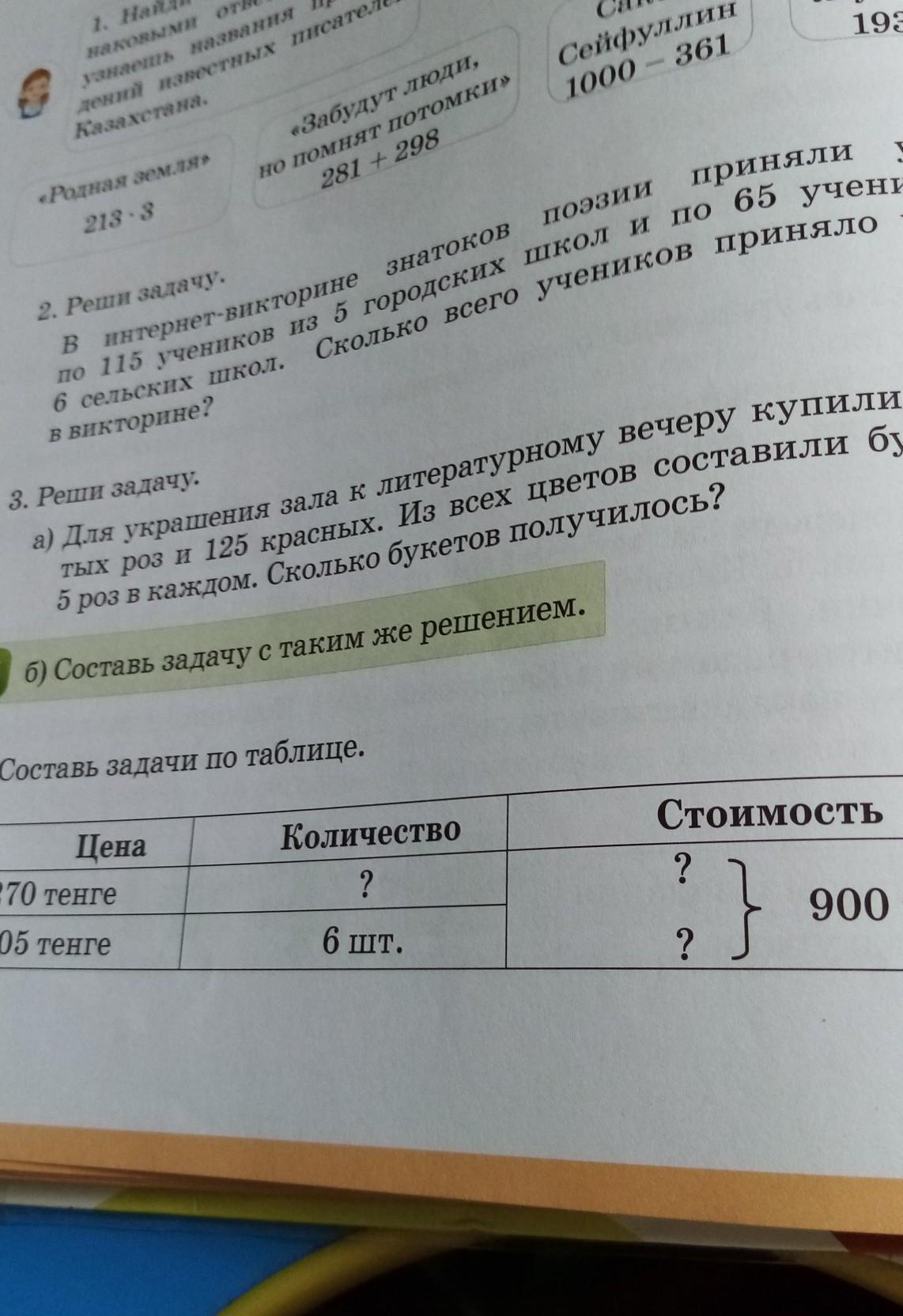 Составь задачи по таблице цена 270 тенге 105 тенге 6 шт