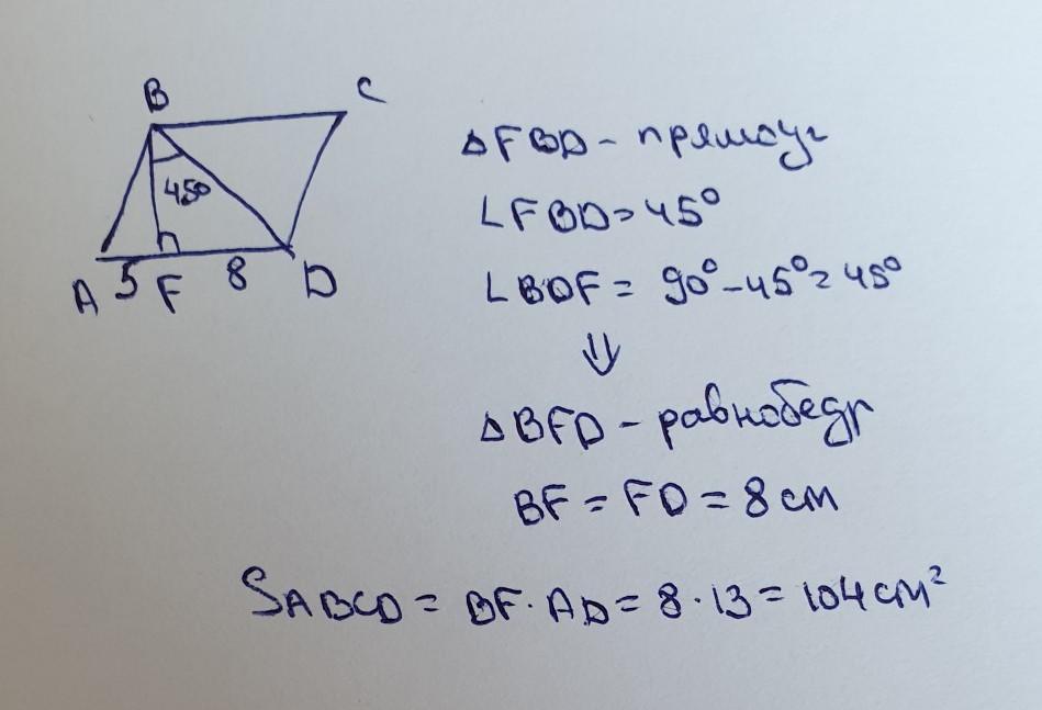 В параллелограмме ABCD проведена высота BF из вершины тупого угла. <FBD=45°, AF=5 см FD=8см Найдите площадь параллелограмма