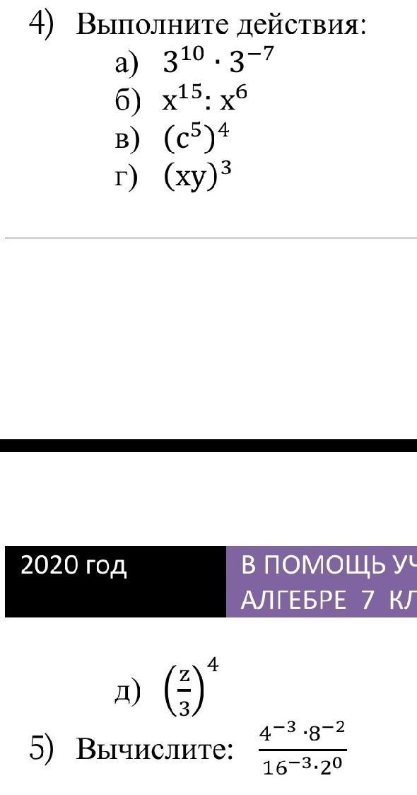 4 ) a) 3¹⁰ * 3⁻⁷= 3¹⁰⁻⁷ = 3³ = 27 ; г) ( xy )³ = x³y³ ;