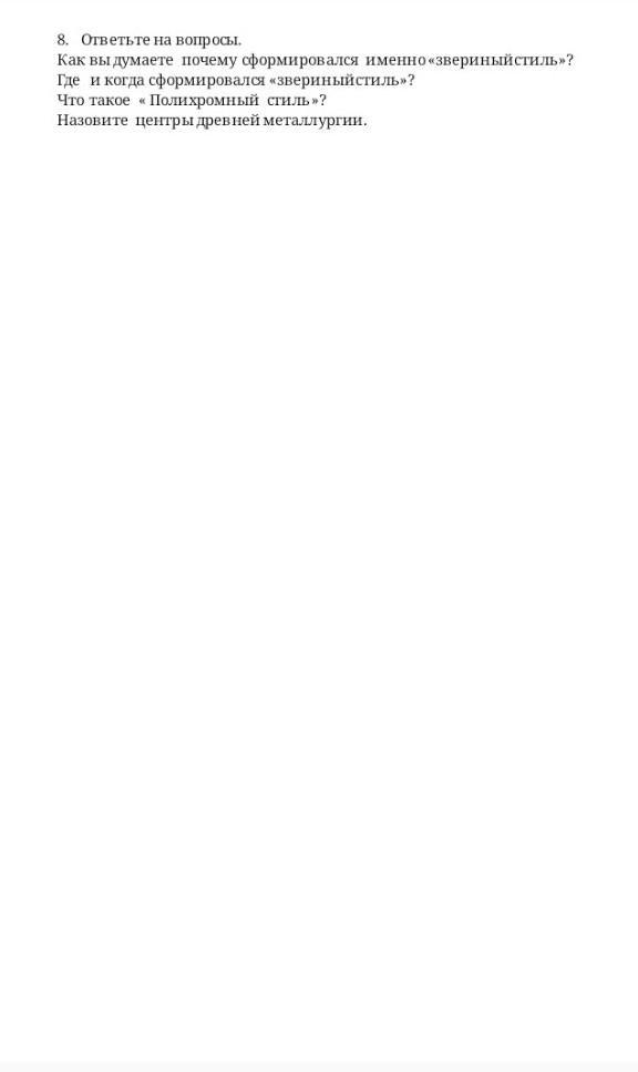 1. звериный стиль орнаментальный стиль возникший самостоятельно в ряде мест строящих свои узоры из элементов условного изображения сначала только зверей а затем человеческих фигур и птиц.
