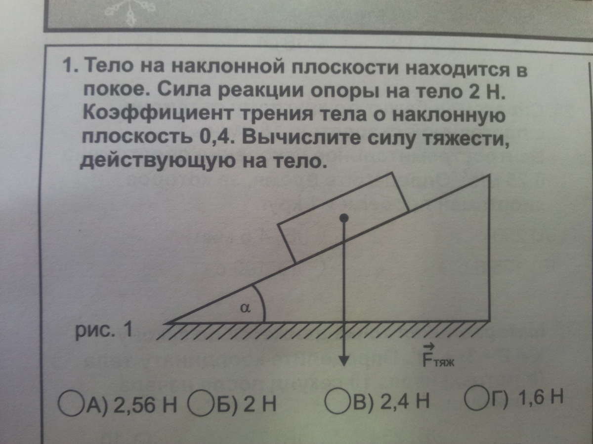 тело наклонной плоскости находится в покое. Сила реакции опоры на тело 2Н. Коэффициент трения тела о наклонную плоскость 0, 4. Вычислите силу тяжести, действующую на тело