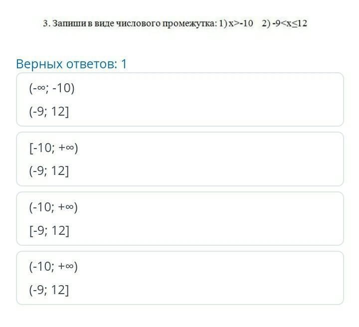 запишите в виде числового промежутка 1)x>-10 2)-9<x<12