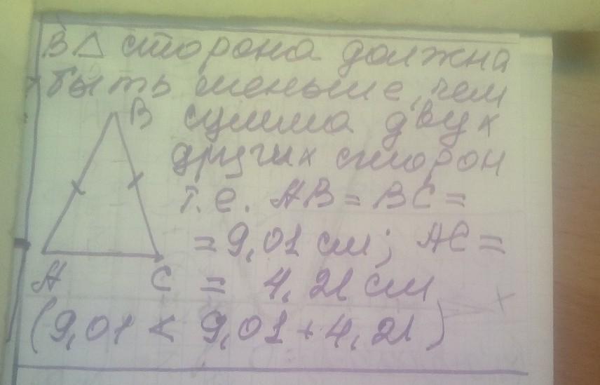 Найдите боковую сторону и основание равнобедренного треугольника, если две его стороны равны 4,21 см и 9,01 см.
