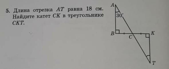 Согласно условию задачи ВС = СК, ∠В = ∠К = 90°, ∠АСК = ∠КСТ как вертикальные. ⇒ треугольники равны по второму признаку (Стороне и двум прилежащим углам) ⇒ АС = СТ = АТ/2 = 9 см, а ∠А = ∠Т = 30°