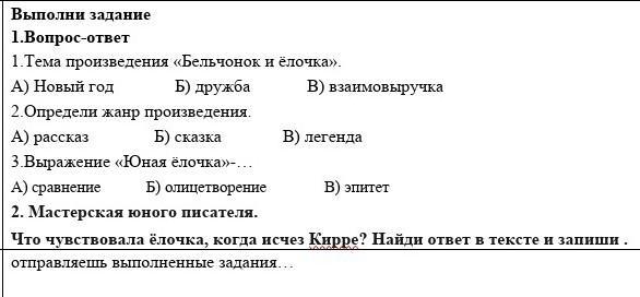 Это случилось поздним летом, уже красные ягоды брусники рассыпались по кочкам. Лесные звери торопились. Перелетные птицы готовились к отлету, ветер сотрясал ветви деревьев, а большинство животных начало подумывать о зимней одежде. Белки собирали в своих кладовках большие склады шишек - зимний запас. И ни у кого не было времени думать об исчезнувшем Кирре. Одна лишь юная елочка испытывала чувство утраты и горя. Она чувствовала себя такой одинокой! Но когда она рассказала другим деревьям о своей утрате, они засмеялись, и с того дня юная елочка ни с кем больше не говорила о Кирре(выпиши самое главное по твоему мнению)