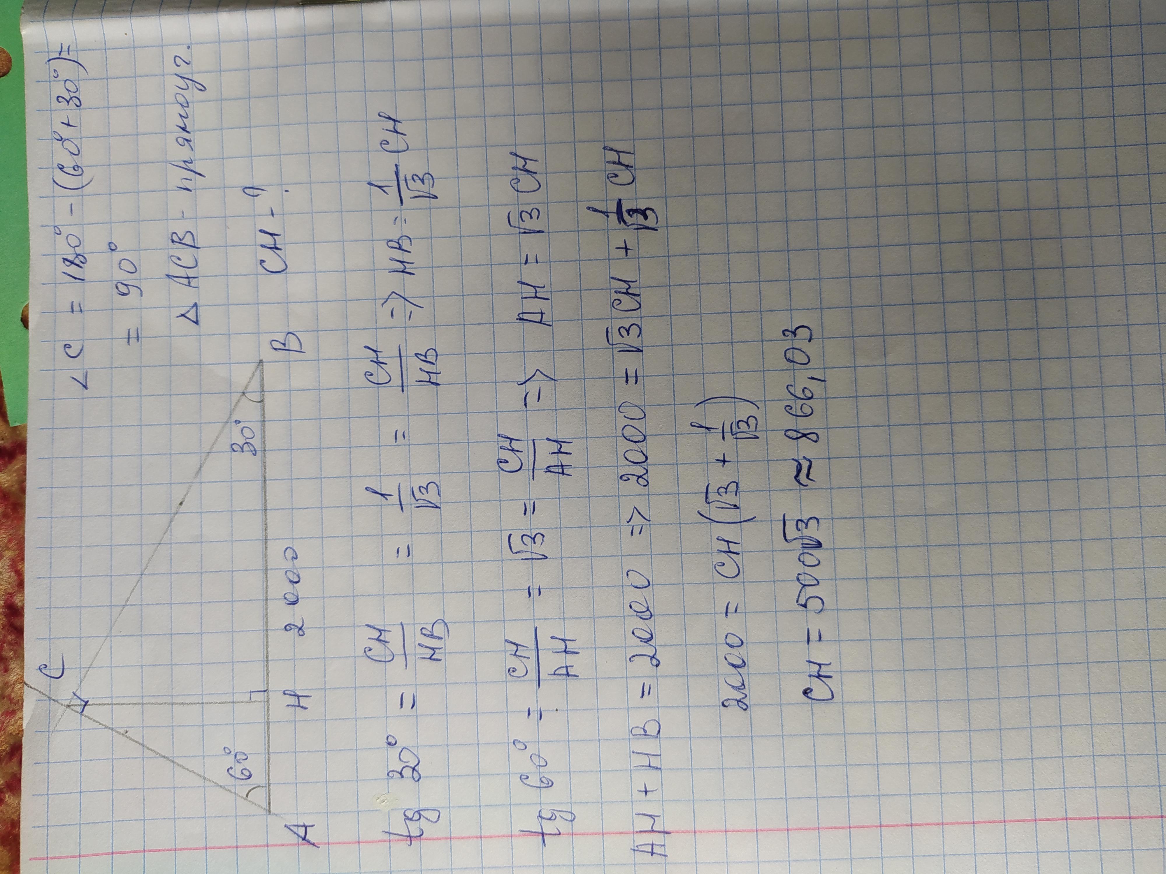 С самолета,летящего горизонтально и прямолинейно на высоте,определены углы А=60° и B=30°,обозначающие начало и конец взлётной полосы 2000м.Определить C,и высоту AC,на которой летит самолет