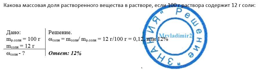 Какова массовая доля растворенного вещества в растворе, если 100 г раствора содержит 12 г соли: