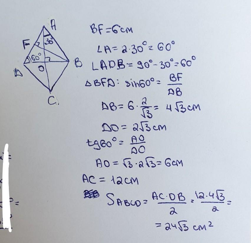 3.В ромбе ABCD, BAC=30°.К стороне AD проведена высота ромба BF равная 6 см.