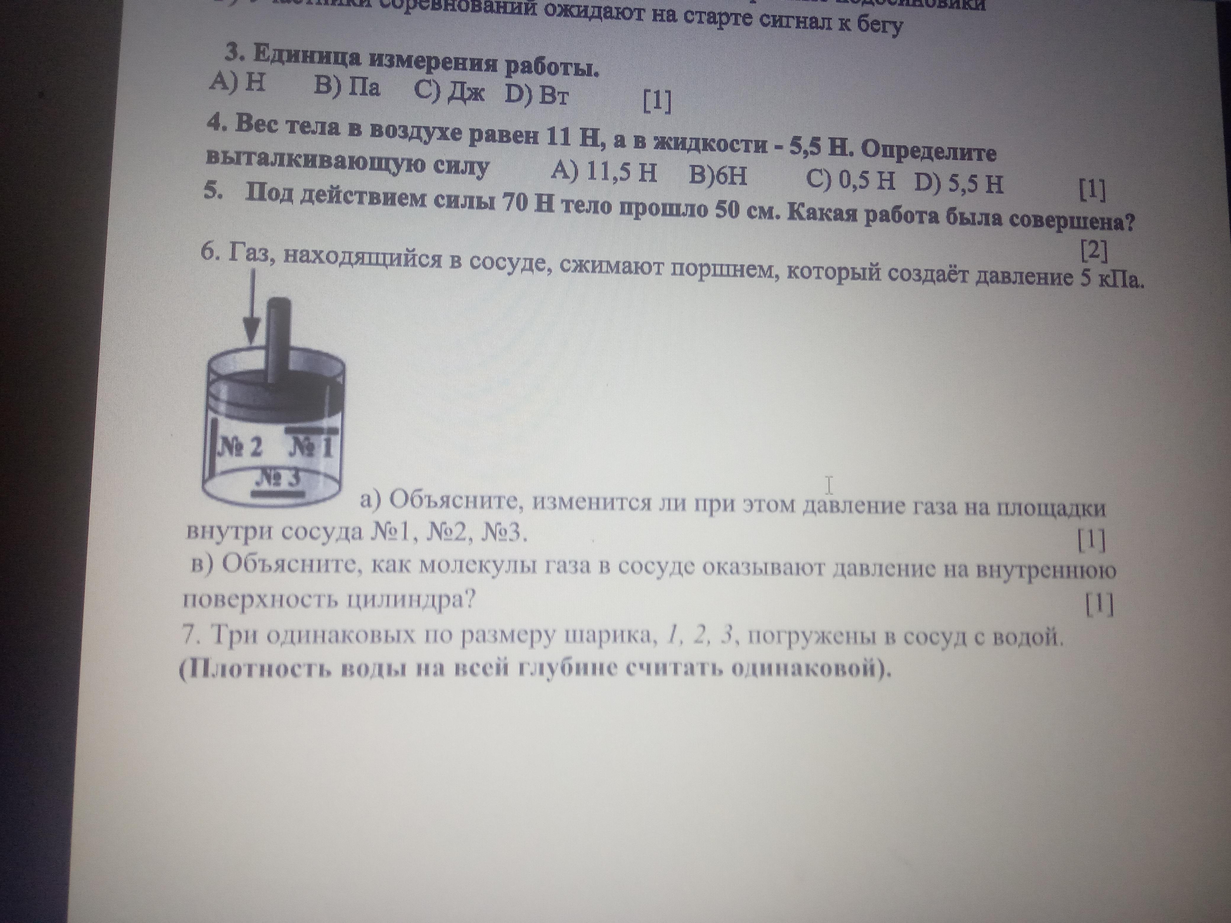 У МЕНЯ СОЧ ПОМОГИТЕЕЕ с 6 и 7 заданием пожалуйста , Газ находящийся в сосуде, сжимают поршнем , который создаёт давление 5кПа.