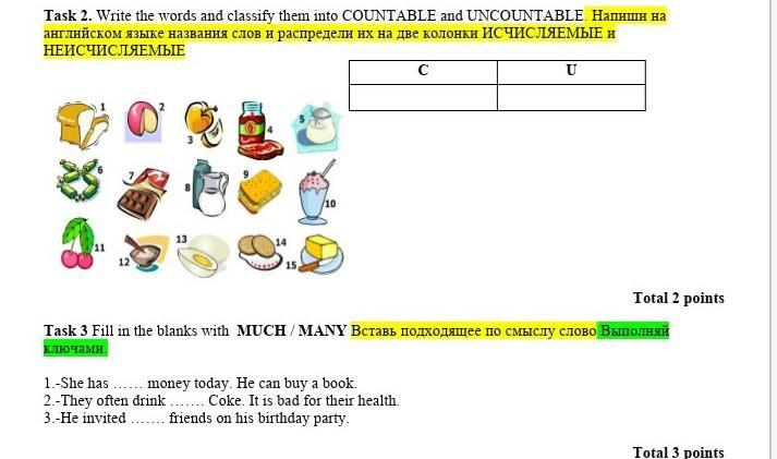 Ответ: Uncountable: bread, jam, cheese, salt, chocolate, milk, cocktail, 12(не знаю что это), egg, butter