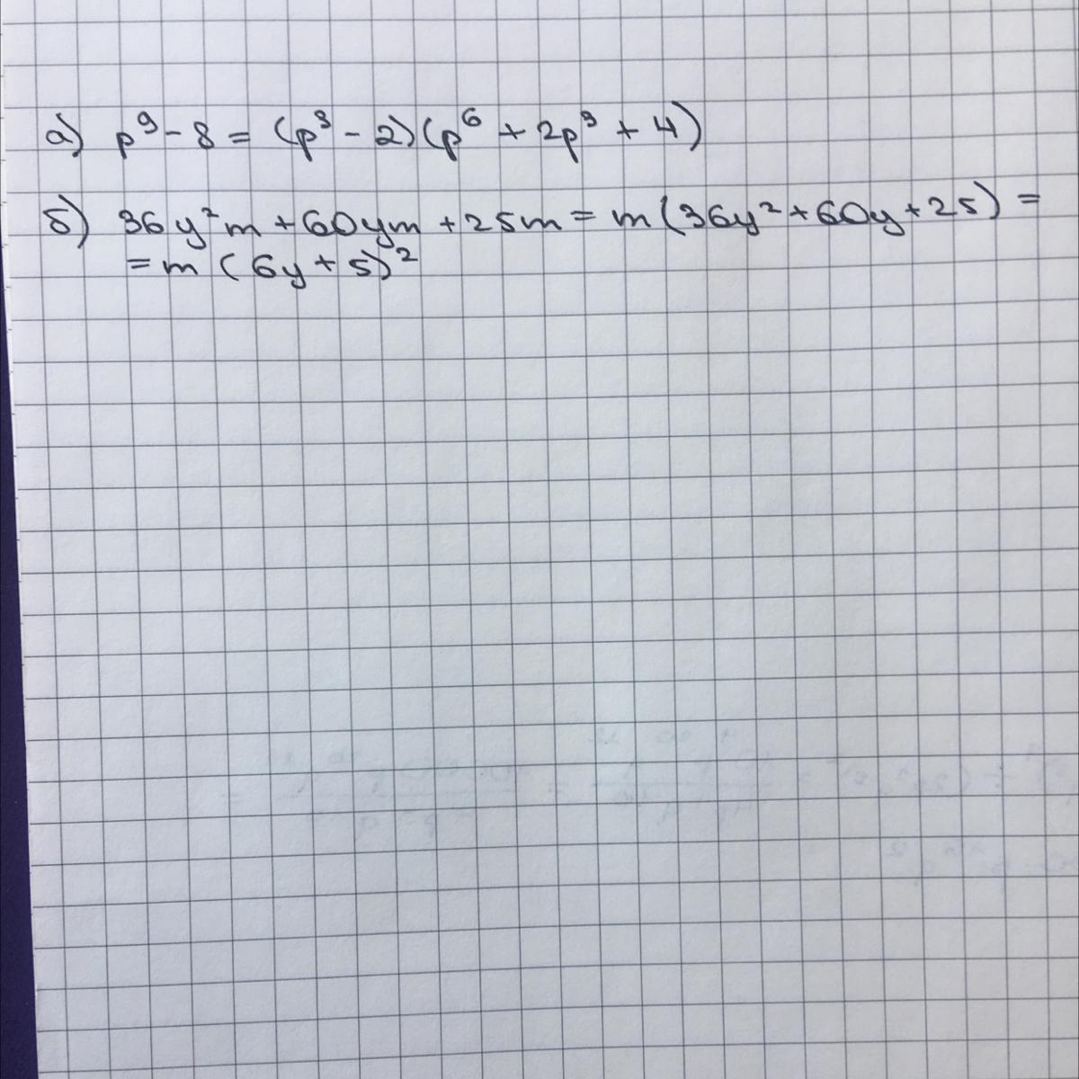 б) 36y²m + 60ym + 25m = m(36y² + 60y + 25) = m( (6y)² + 2 × 6y × 5 + 5²) = m(6y + 5)²