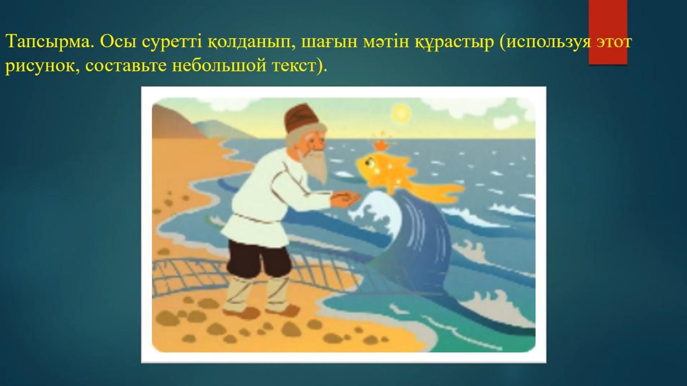 Көк теңіздің жағасында балық аулап,тіршілік ететін. Қария бір күні жолы болып алтын балық ұстап алды. Алтын балық атайдан өзін босатуын сұрады. Егер өзін босатса, тілектерін орындайтындығын айтты.