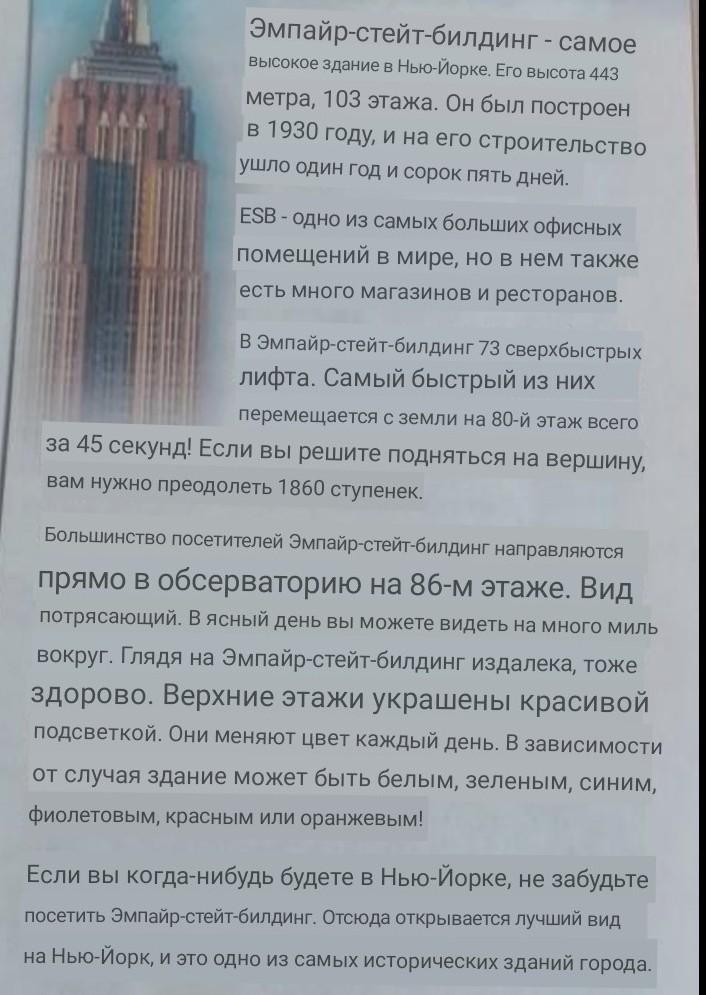 Эмпайр-стейт-билдинг - самое высокое здание в Нью-Йорке. Его высота 443 метра, 103 этажа. Он был построен в 1930 году, и на его строительство ушло один год и сорок пять дней. ESB - одно из самых больших офисных помещений в мире, но в нем также есть много магазинов и ресторанов. В Эмпайр-стейт-билдинг 73 сверхбыстрых лифта. Самый быстрый из них поднимается с земли на 80-й этаж всего за 45 секунд! Если вы решите подняться на вершину, вам нужно преодолеть 1860 ступенек. Большинство посетителей Эмпайр-стейт-билдинг направляются прямо в обсерваторию на 86-м этаже. Вид потрясающий. В ясный день вы можете видеть на много миль вокруг. Глядя на Эмпайр-стейт-билдинг издалека, тоже здорово. Верхние этажи украшены красивой подсветкой. Они меняют цвет каждый день. В зависимости от случая здание может быть белым, зеленым, синим, фиолетовым, красным или оранжевым! Если вы когда-нибудь будете в Нью-Йорке, не забудьте посетить Эмпайр-стейт-билдинг. Отсюда открывается лучший вид на Нью-Йорк, и это одно из самых исторических зданий города.