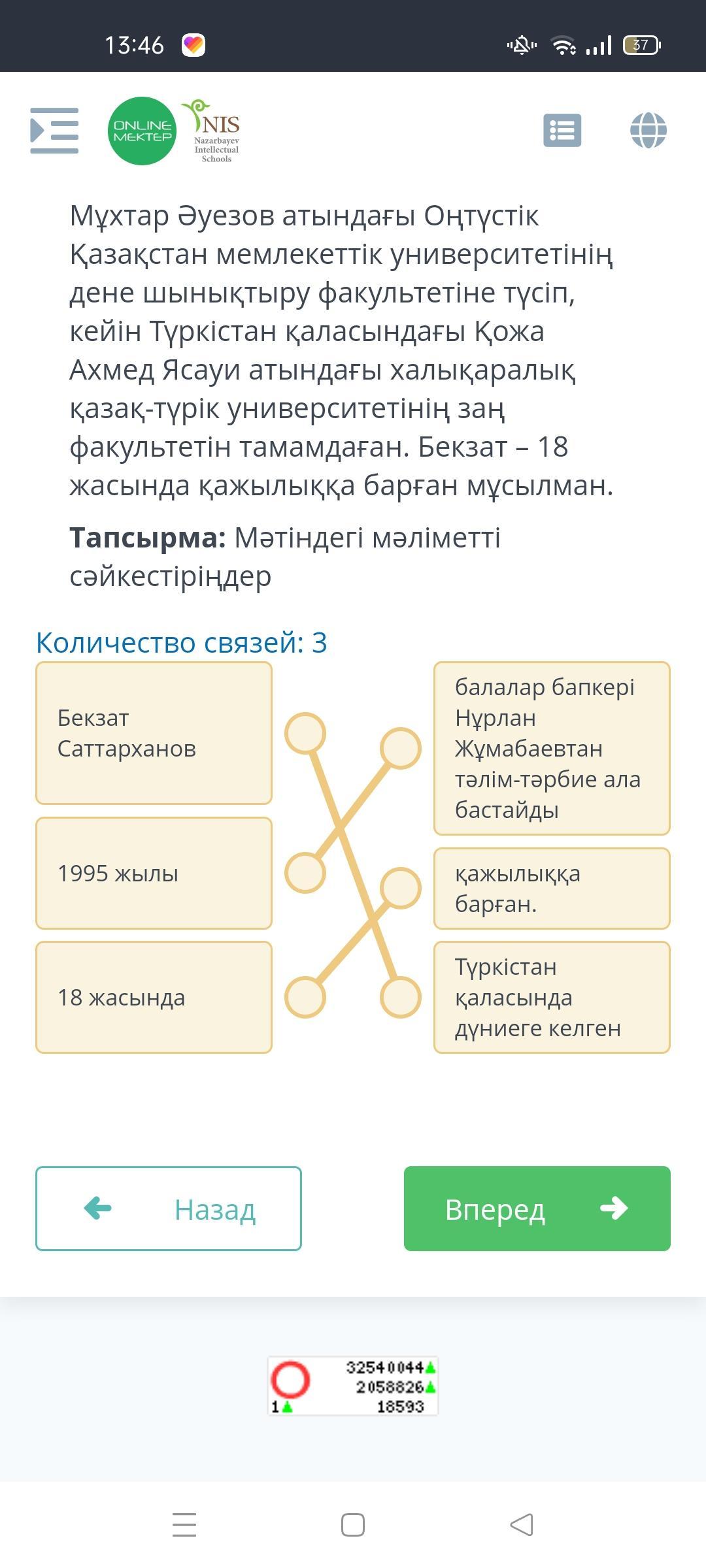 Тапсырма: Мәтіндегі мәліметті сәйкестіріңдер