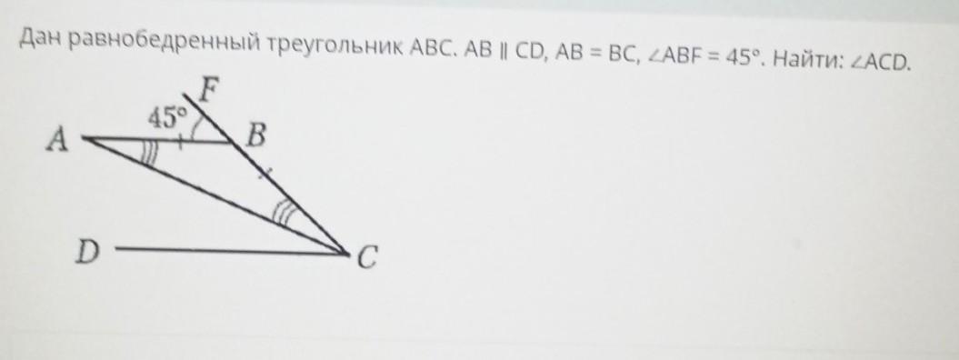 Дан равнобедренный треугольник ABC. AB || CD, AB = BC, ABE = 45°. Найти: ACD.