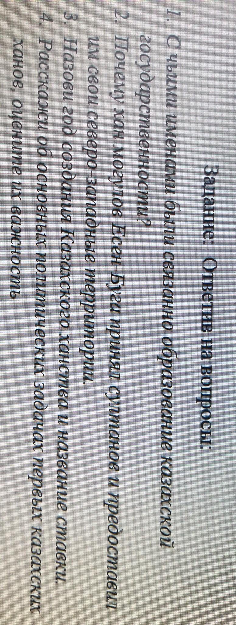 1. Образование Казахского ханства тесно связано с именами султанов Керея и Жанибека. ... Дело укрепления казахской государственности продолжили сыновья Керея и Жанибека - Мурындык и Касым. В период правления Касым хана впервые после монгольского нашествия были объединены в одном государстве все казахские роды и племена.