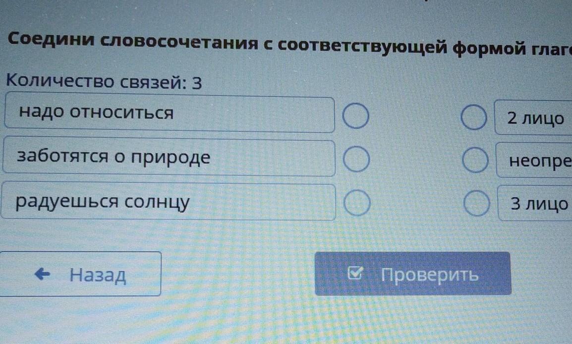 соедини словосочетания с соответствующей формой глагола надо относиться заботиться о природе радуешься Солнцу второе лицо неопределённая форма третьего лица