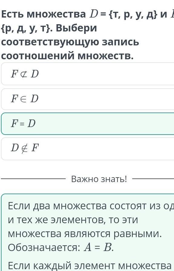 Есть множества D = {т, р, у. д) и F= {р, д, у, т}. Выбери соответствующую запись соотна