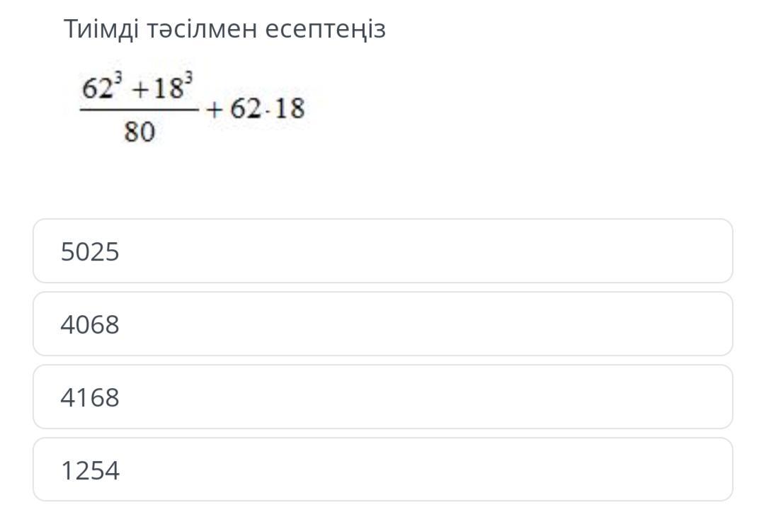 (62³+18³)/80 +62·18=((62+18)(62²-62·18+18²))/(62+18) +62·18=62²-62·18+18²+62·18=62²+18²=3844+324=4168