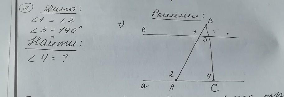 Поскольку угол1=угол2 (как соответствующие углы), а параллельна b. Значит сума угла3 и угла4 = 180° (внутренние односторонние углы) и угл4= 40°