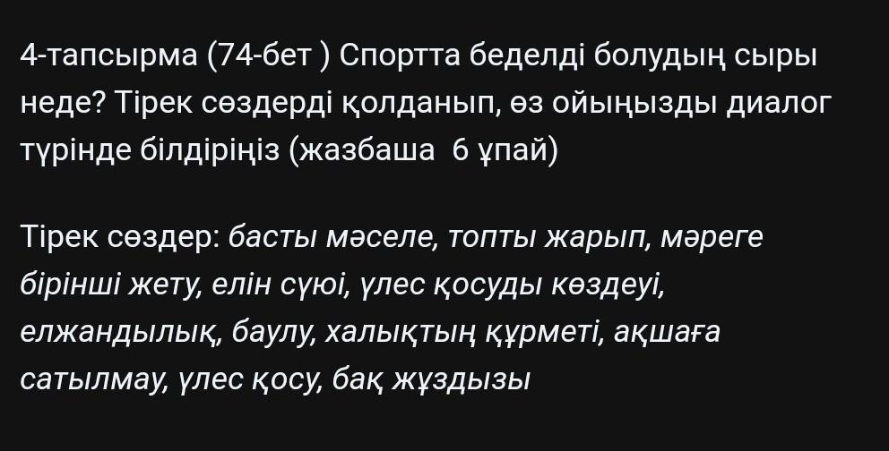 Спортта беделді болу үшін шыдамды, төзімді болу керек. Басты мәселе- өзіңді шыңдап, жеңіске ұмтылу. Жүгіру спортына тоқталайық, онда топты жарып, мәреге бірінші жету қажет. Мәреге кім бірінші жетсе, сол жеңіске жетеді. Жеңіспен қоса, елін сүюі қажет және елінің көркеюіне үлес қосуды көздеуі керек. Басқаларды да елжандылыққа баулу керек. Спортшы үшін ең басты қошемет- халықтың құрметі, елінің бақ жұлдызы бола алуы. Спортшы ақшаға сатылмау керек,керісінші өз командасының жеңіске жетуіне үлес қосу керек.