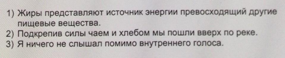 Жиры представляют собой источник энергии, (превосходящий другие питательные вещества.) 2) (Подкрепившись чаем и хлебом,) мы пошли вверх по реке. 3) Я ничего не слышал, (кроме внутреннего голоса.)