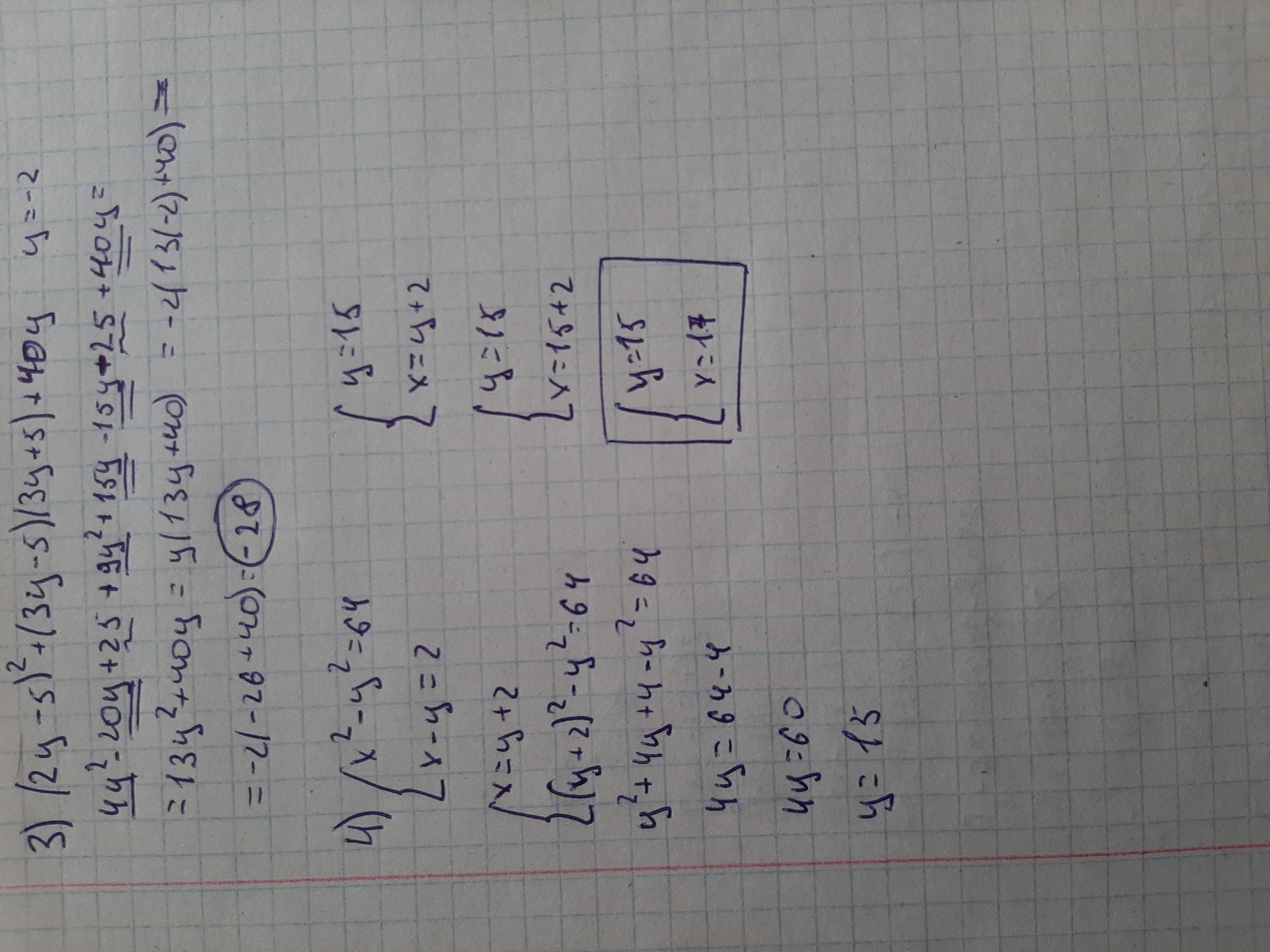 3. Упростите выражение: (2y – 5) + (3y – 5 (3y+5)+ 40 уи найдите его значение при у = -2