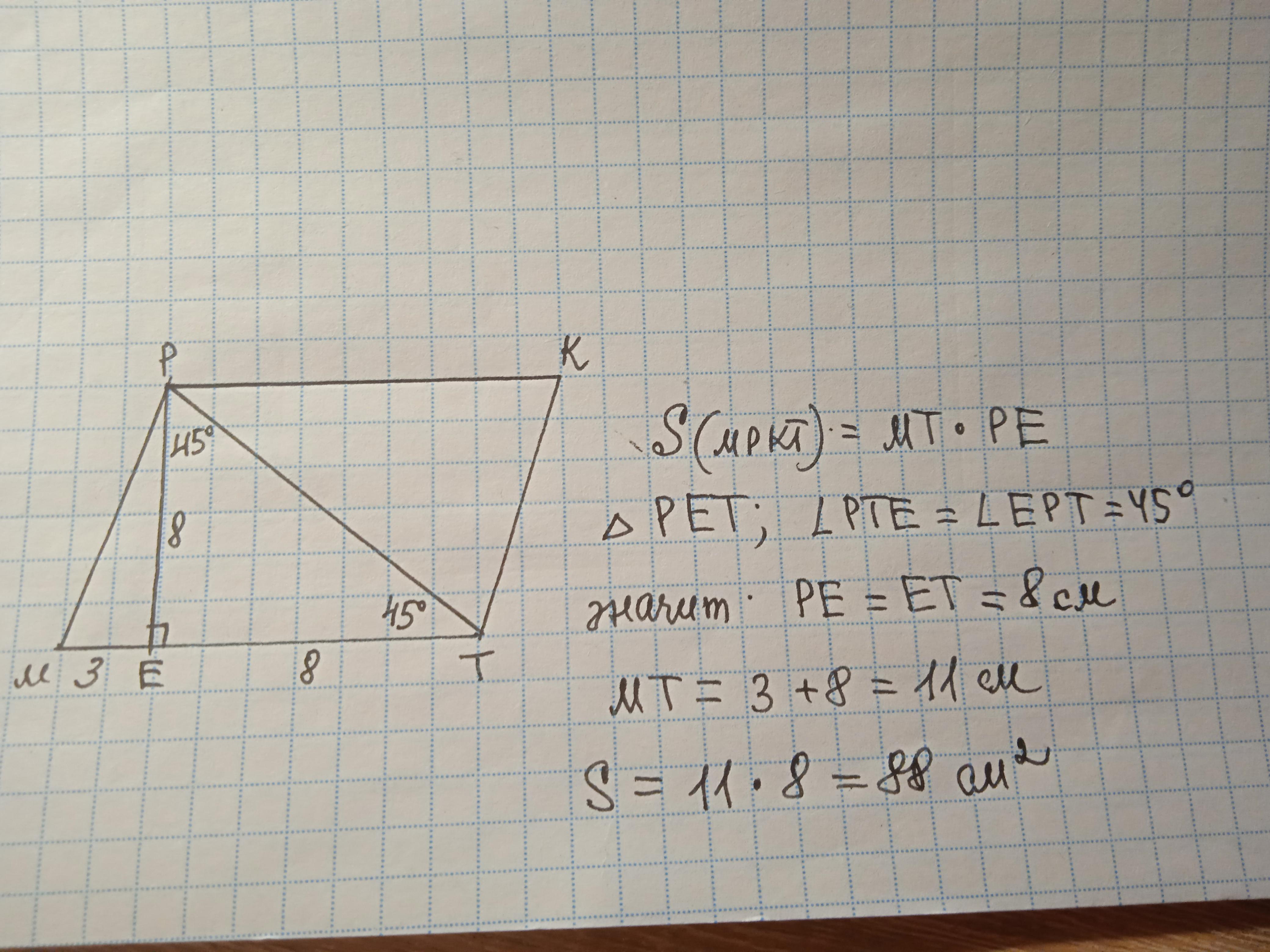 2ETP = 450 ME = 3 см, ET = 8 см. Найдите площадь параллелограмма.