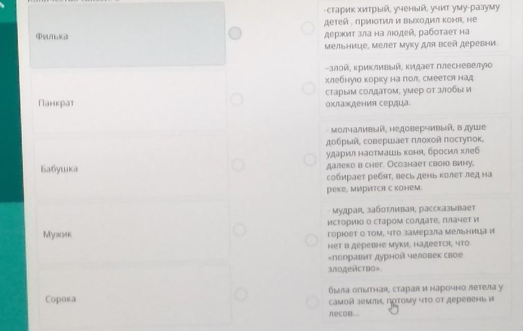 Ответ:ФИЛЬКА-МОЛЧАЛИВЫЙ,НЕДОВЕРЧИВЫЙ,В ДУШЕ ДОБРЫЙ,СОВЕРШАЕТ ПЛОХОЙ ПОСТУПОК,УДАРИЛ КОНЯ.....