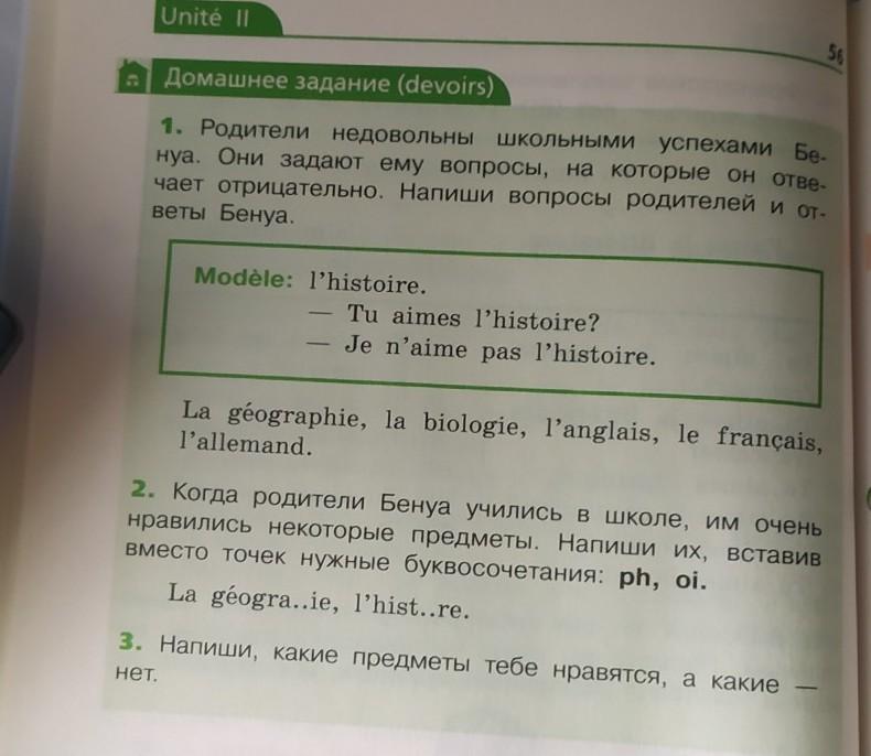 1. Tu aimes la géographie? - Non, je n’aime pas la géographie. Tu aimes la biologie ? - Non, je n’aime pas la biologie. Tu aimes l’anglais ? - Non, je n’aime pas l’anglais. Tu aimes le français ? - Non, je n’aime pas le français. Tu aimes l’allemand ? - Non, je n’aime pas l’allemand.