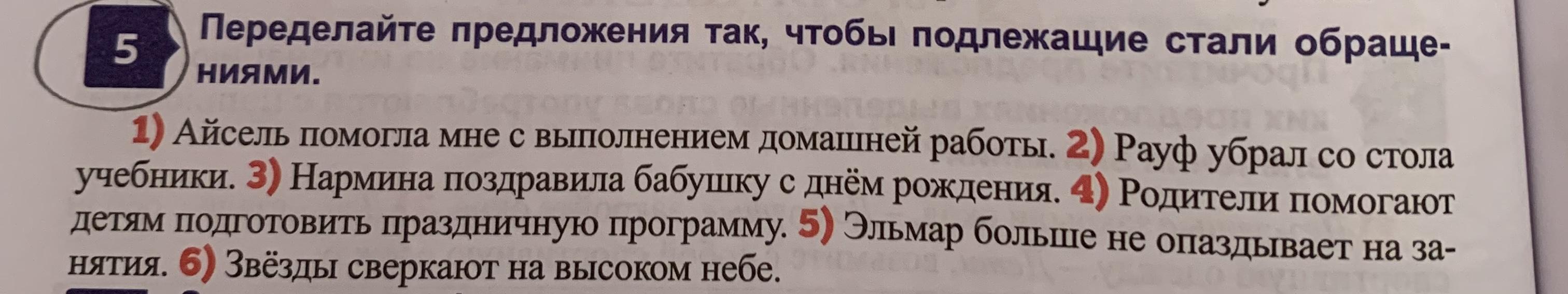 Айсель, помоги мне с выполнением домашней работы. Рауф, убери со стола учебники. Нармина, поздравь бабушку с днём рождения. Родители, помогите детям подготовить праздничную программу. Эльмар ,больше не опаздывай на занятия. Звёзды, сверкайте на высоком небе.