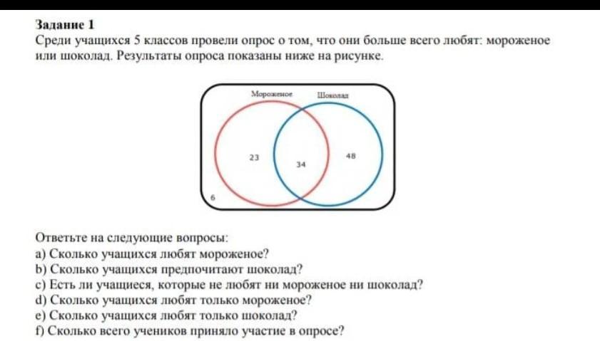 f) 23 + 48 + 34 + 6 = 111, все учащиеся только из красного, только из синего, из пересекающейся области и вне обоих кругов