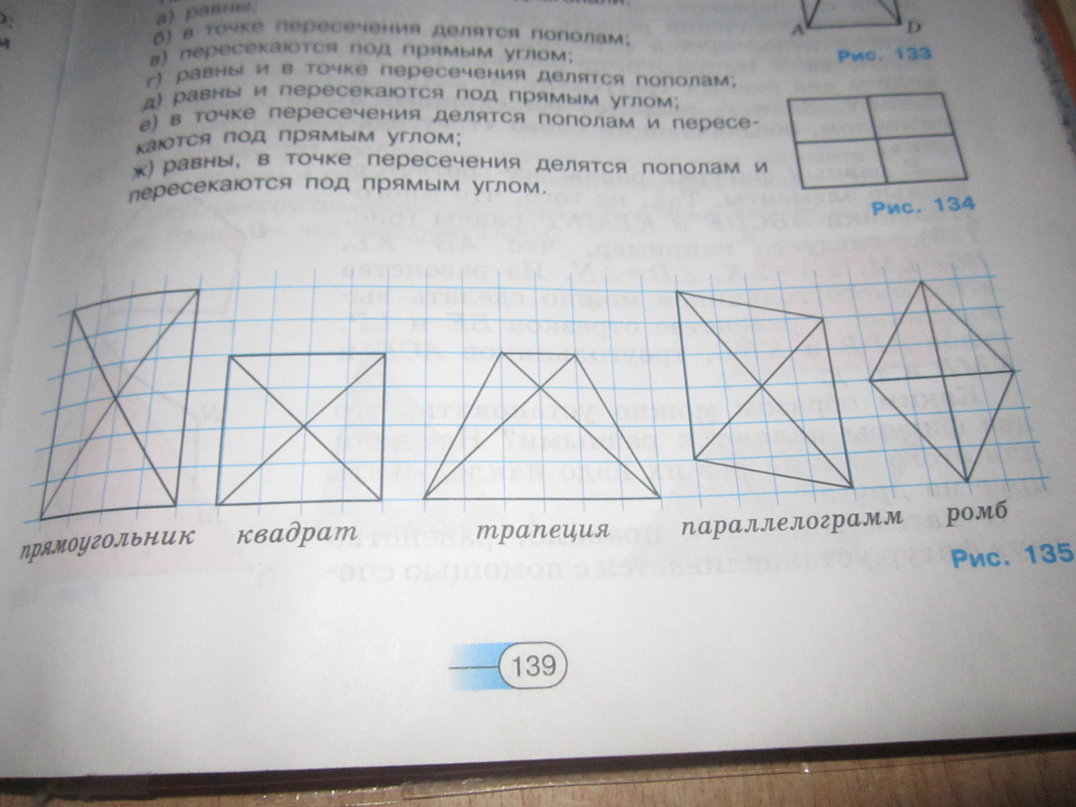 На рисунке 135 изображены различные четырехугольники.(Прямоугольник,квадрат,трапеция,параллелограмм,ромб.)