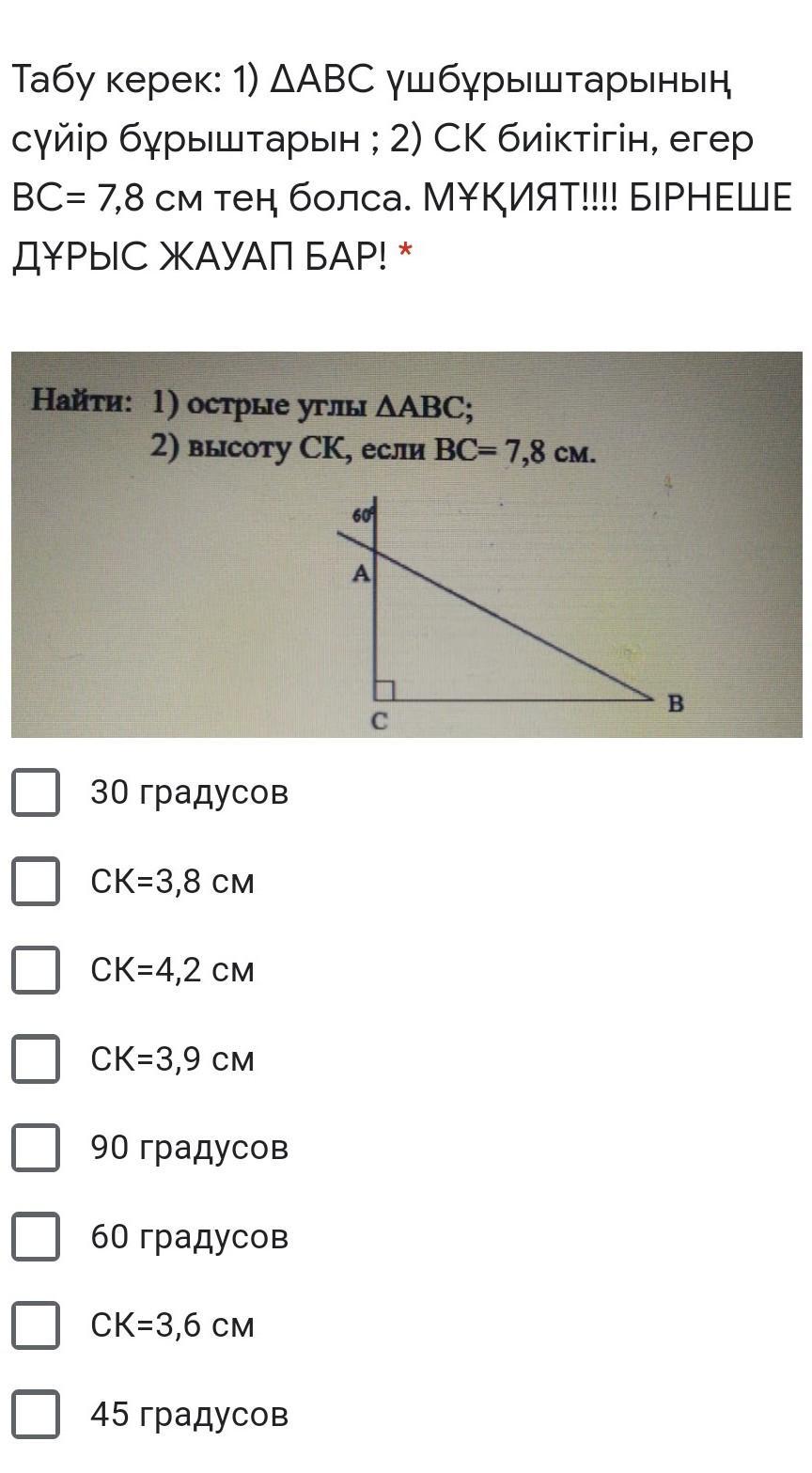 Углы будут А=60, В=30(свойство прямоугольного треугольника и вертикальных углов)