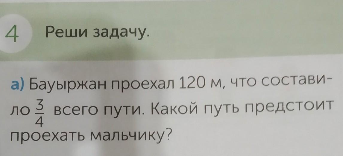 Бауыржан проехал 120 м что составило 3/4 всего пути.Какой путь предстоит проехать мальчику?