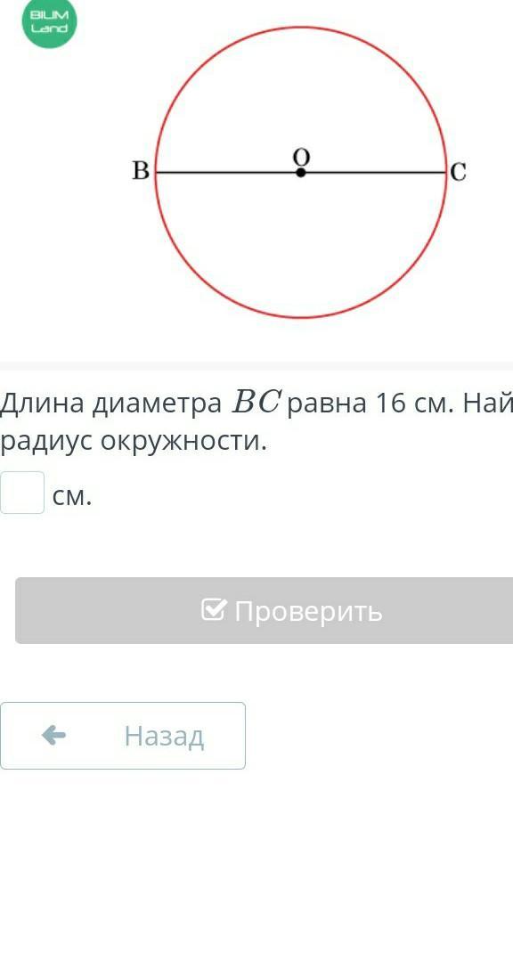 Длина диаметра BC равна 16 см. Найди радиус окружности.