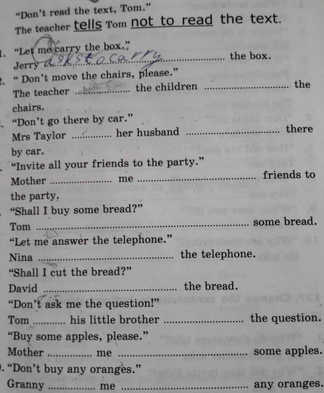 Jerry offers to carry the box. The teacher asks not to move the chairs. Mrs Taylor asks not to go there by car. Mother asks to invite all my friends to the party.