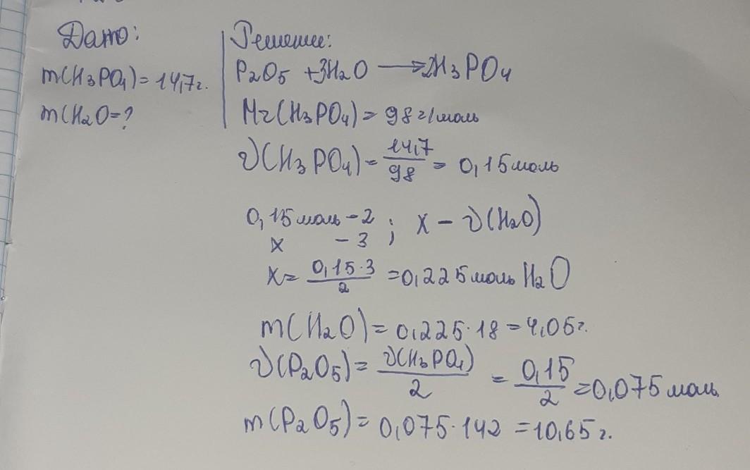 При взаимодействии оксида фосфора (V) с водой образовалось 14,7 грамм фосфорной кислоты (H3Po4). Найдите массы воды и оксида вступившие в реакцию.