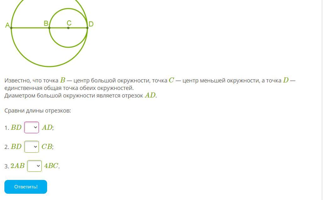 Известно, что точка B — центр большой окружности, точка C — центр меньшей окружности, а точка D — единственная общая точка обеих окружностей.