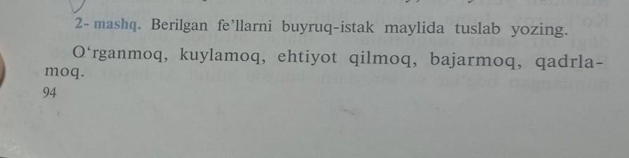 o'rganmoq - o'rgan, kuylamoq - kuyla, ehtiyot qilmoq - ehtiyot qil, qadrlamoq - qadrla