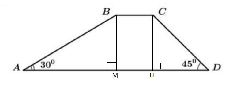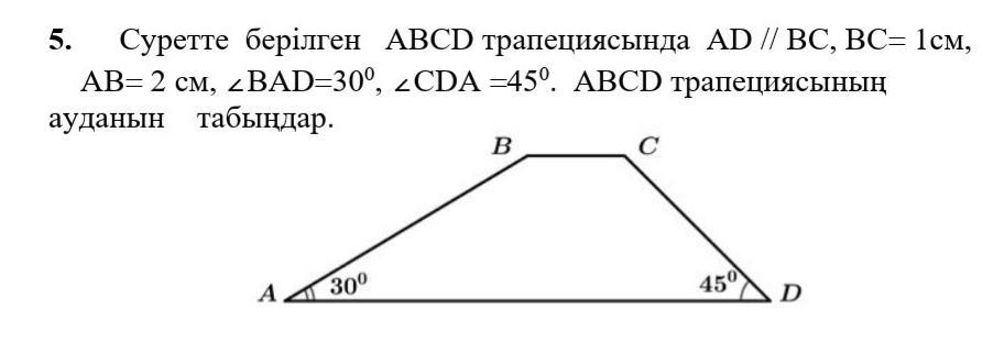 В трапеции ABCD, показанной на рисунке AD // BC, BC = 1 см, AB = 2 см, ∠BAD = 30 °, ∠CDA = 45 °. Найдите площадь трапеции ABCD