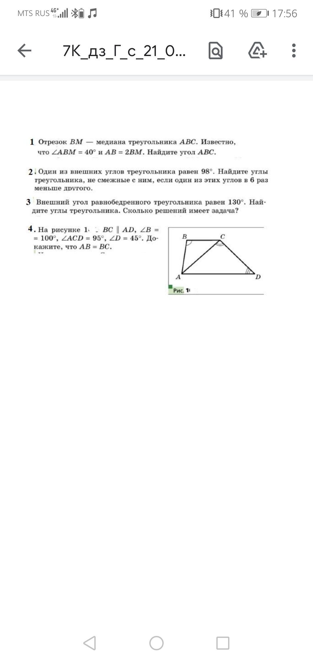 Принимаем ВМ=10 см АВ=20 см угол между ними 40°